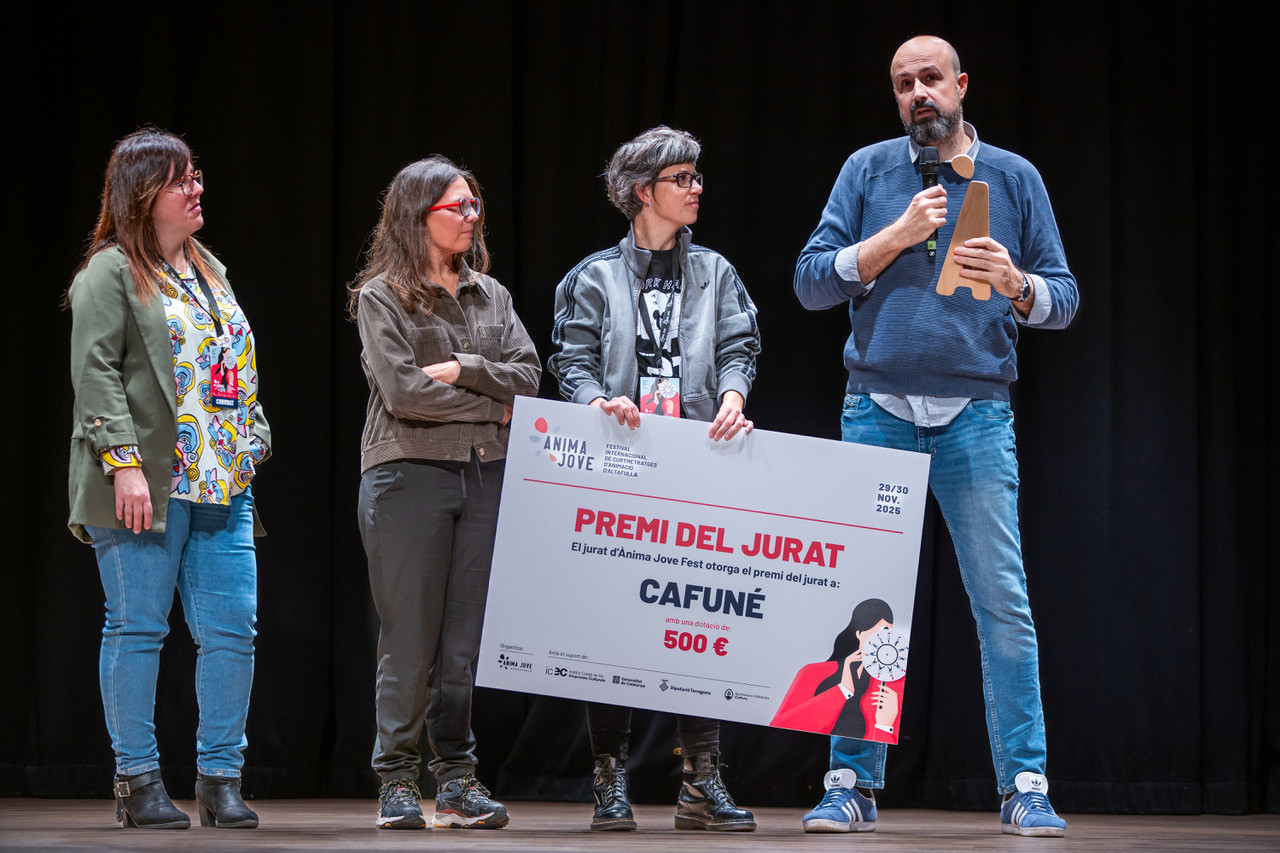 Una de les grans novetats d’enguany va ser l’estrena d’un Jurat Oficial, del qual la codirectora del FIC-CAT, Cris Gambín, va exercir com a presidenta. Gambín, juntament amb Gemma Maymó i Ariadna Costa, han lliurat el Premi del Jurat Ànima Jove 2025, al curtmetratge “Cafuné” de Lorena Ares y Carlos Fernández de Vigo.
